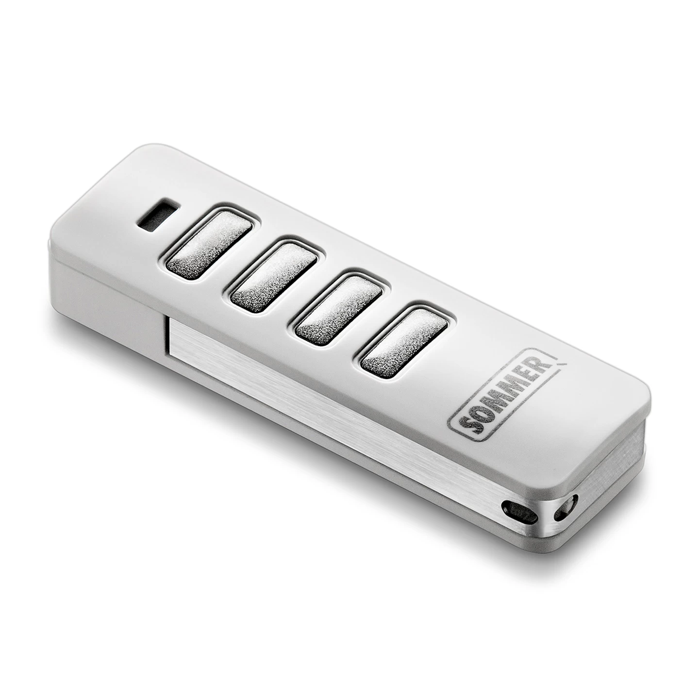 Auf der Oberseite des SOMMER Handsender Pearl Vibe, weiß, Edelstahl sind insgesamt vier Funktionstasten aufgereiht. Mit jeder dieser Tasten kann ein einzelner Befehl an einem SOMMER-Torantrieb programmiert werden, so dass maximal vier solcher Befehle möglich sind. Bei einem solchen 4-Befehl-Handsender besteht jedoch die Wahlmöglichkeit, alle Tasten auf nur einen Antrieb anzulernen oder auch auf bis vier verschiedene Geräte aufzuteilen.